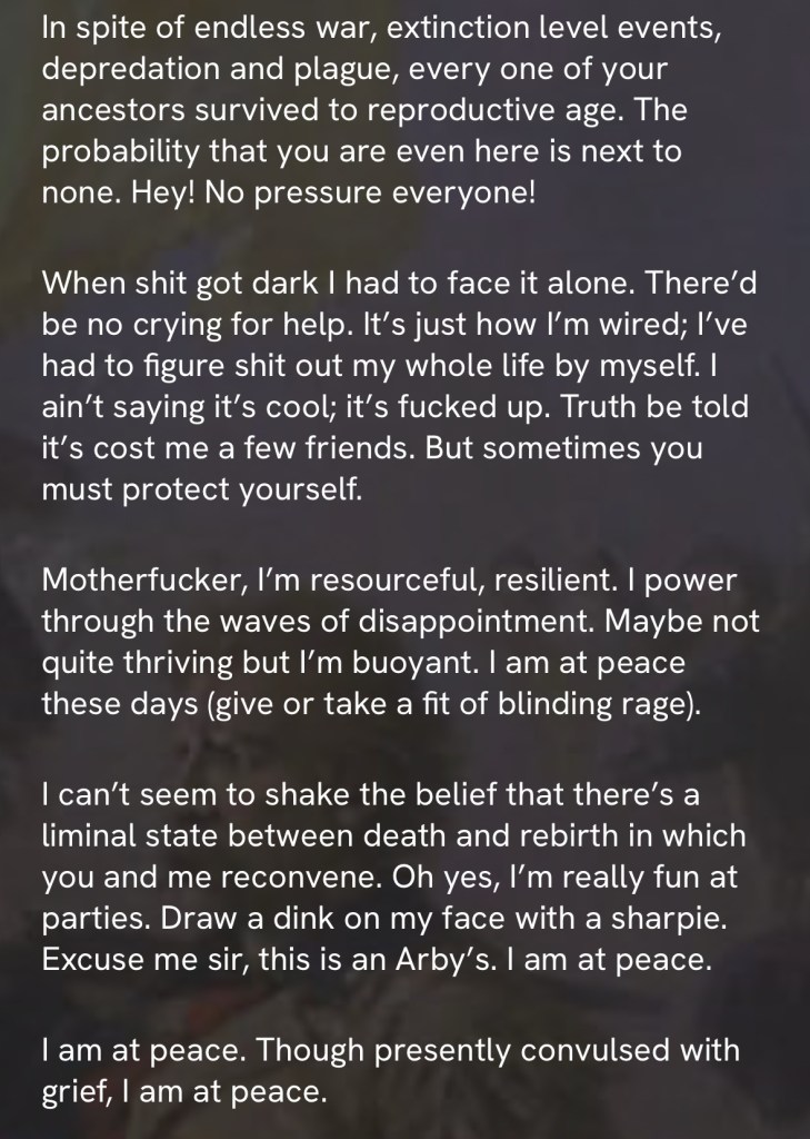 In music, punk / metal / post-hardcore band Propagandhi just released their first album in eight years, and it’s absolutely incredible. Between the killer riffs and breakdowns, the lyrics are angry, funny, but also somewhat resigned, coming to terms with the state of the world that any of us could leave at any moment.
