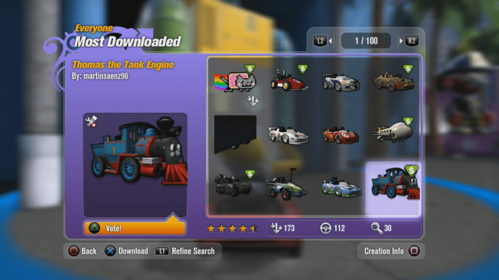 But it’s what’s outside of the racing that makes ModNation special. Customizing a character and kart isn’t too special, but the fact that you can share them is. There is still an active community full of people sharing their creations online.