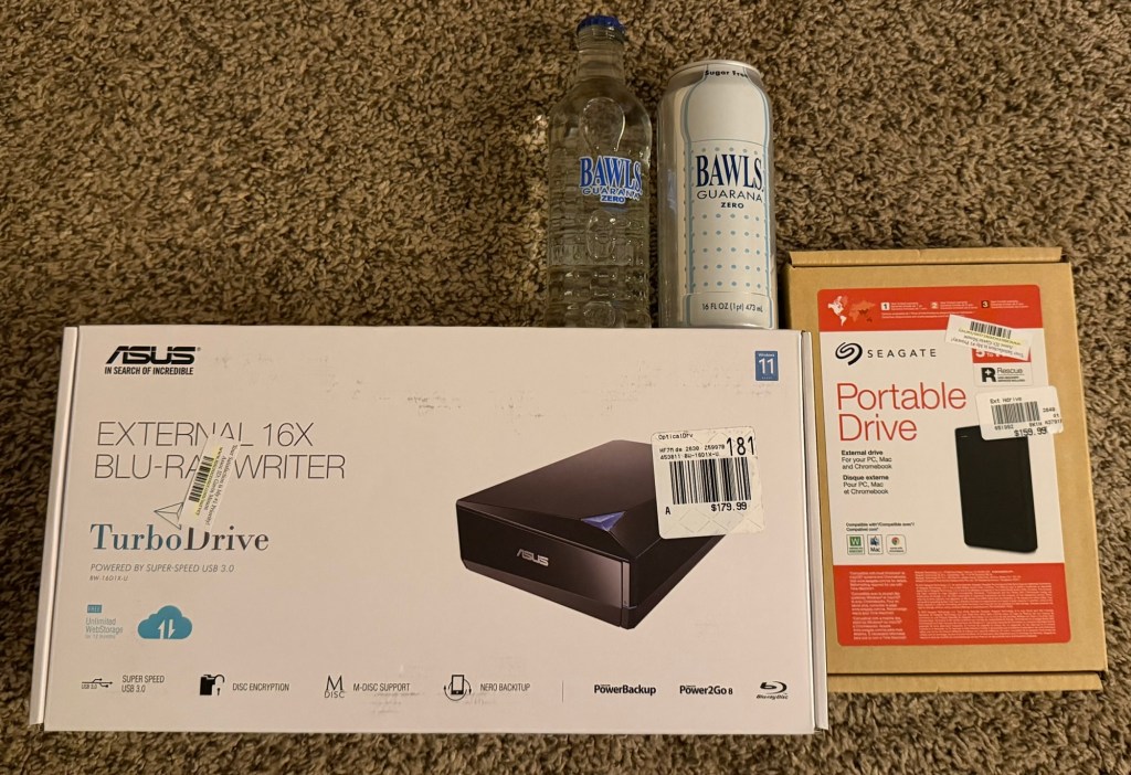 On Valentine’s Day I made a big purchase at Micro Center, in the form of a recordable CD / DVD / Blu-ray drive and a 5TB portable hard drive (and some BAWLS).